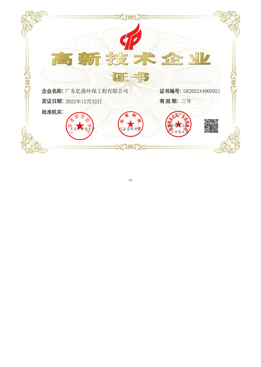 高新技术企业证书
